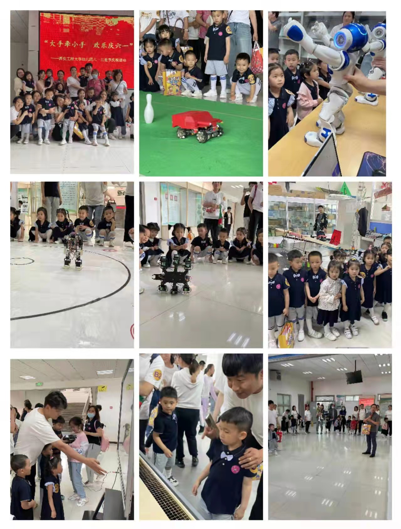 在宽敞明亮的入门大厅,陈永当致欢迎词,寄托了对小朋友们的殷切希望和衷心祝福,向家长和小朋友简要介绍了工程训练中心好玩的“秘密宝藏”。在中心老师娓娓动听的讲解和学生志愿者的精心指引下,孩子和家长们先后参观了中心现代化数控加工、激光加工、机器人舞蹈表演、赛车竞技表演、无人机飞行表演、航模虚拟飞行、木工坊、3D打印和创客咖啡等蕴含高科技元素符号的开放实训室。一楼丰富的加工设备和浓厚的科技感氛围让小朋友满眼惊喜,内心充满了无尽的好奇;二楼的激光加工产品,吸引着大朋友和小朋友驻观合影;三楼各式各样机器人赏心悦目的表演,孩子零距离与机器人尽情互动交流更是点燃了内心求知的火苗,不时引来孩子们的高声呐喊和雀跃欢呼;四楼极具特色的无人机飞行表演,航模模拟飞行仿佛把孩子带到了另一个色彩斑斓的美好世界,大家开心地合影留念,留下这难忘而美好的瞬间。参观期间,整个工程训练中心散发着温馨祥和的气息,到处童声鼎沸,充满了爱和希望。